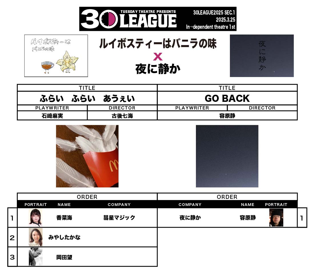 第一節のオーダー表を見ても演出ににほひの古後七海を迎え、さらに出演者にも前回30リーグ2024にてにほひの作品に出演した香菜海(彗星マジック)を起用しており、ユニット名こそ違えどにほひのリベンジをソロユニットで果たそうという気概が伺える布陣が興味深い。