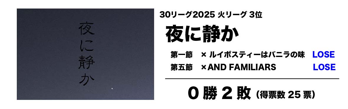 去年は『カムパネルラ』の主宰として30リーグに挑んだ容原静が、期間限定の個人ユニットとして再び30リーグに参戦。残念ながら今回も勝利を挙げることは叶わなかったが、他に比類なき個性的な2作品はいずれもインパクト大。好き嫌いのはっきり分かれる作風なれど評価する声は公演を重ねる毎に着実に増えて来ている模様。30リーグ期間中に『カムパネルラ』のメンバーが大幅に増えた様なので、次はぜひ新生『カムパネルラ』として30リーグに戻って来て欲しい。