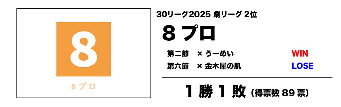 ド派手な衣装、大人数キャスト、舞台を縦横無尽に使った殺陣と、火ゲキ30×30の枠に収まらないスケールの王道エンタメで、大いに会場を盛り上げてくれた8プロ。ただそのスケールの大きさ故か上演時間を30分に収めきる事が出来ず、時間オーバーにより二試合計で16ポイントも減点されてしまったのは痛恨。結局その減点が響いて、僅差で惜しくも30CLIMAX進出を逃してしまったが、それも勝敗よりもお客さんの満足を優先するエンタメ精神故と思われる。まさに『負けて尚侮り難し』の印象を残した。
