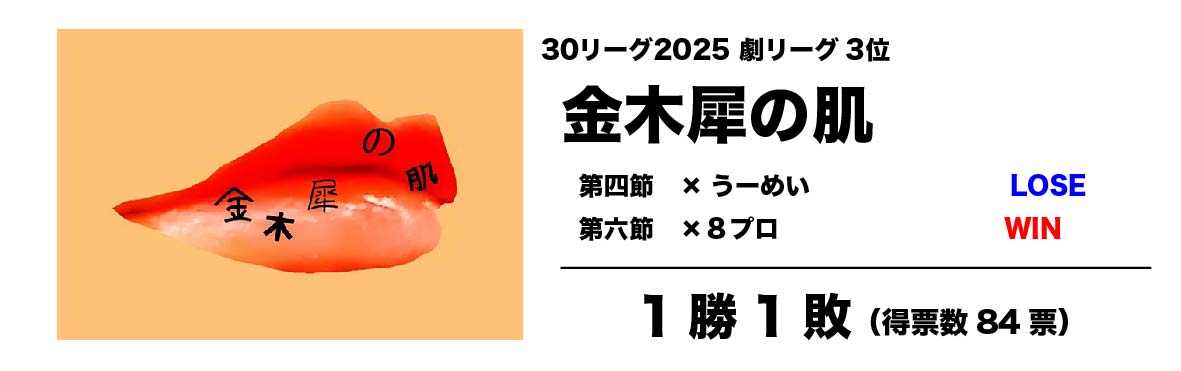 高い文学性を感じさせる脚本、細部まで計算の行き届いている洗練された演出、そして適材適所のキャスティングと、すべてにおいてクオリティの高い2作品を揃えた金木犀の肌。順位こそリーグ3位という結果になってしまったが上演した2作品の評価はいずれも高く、例えば 30リーグの様な観客投票型ではなく演劇関係者が審査員のコンペディションであれば優勝していたのではないか?という声も多かった。